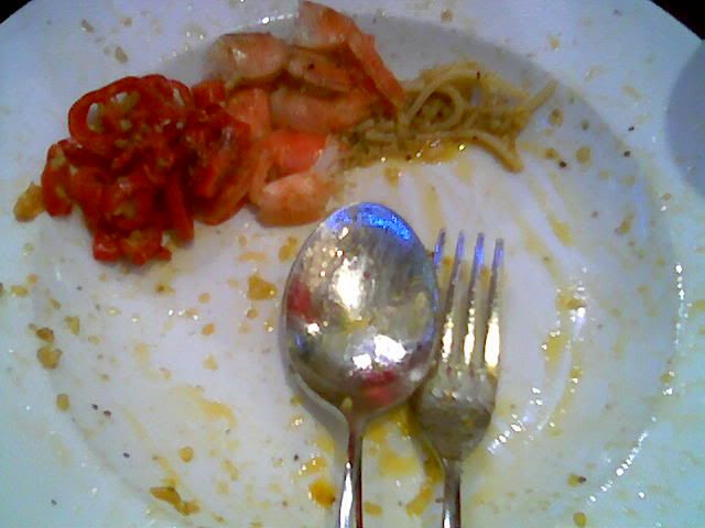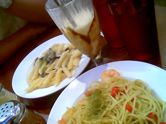 After school, waited for Marc to come pick me up for dinner. wanted to go home cos i'm so tired..but decided to fill my stomach first. haha. So, we went to Pomodoro cos someone wanna eat Italian...and man...my all-time-fav spag prawn aglio olio was such a big serving while he had penne mushroom carbonara and mango drink...